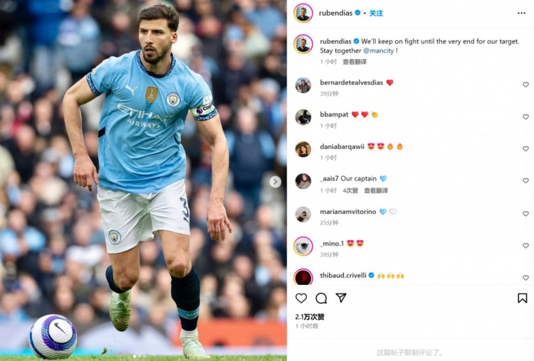 魯本-迪亞斯曬出自己的比賽照,并配文:“我們將會繼續(xù)為了目標而戰(zhàn)斗到最后一刻。團結起來@曼城俱樂部!”