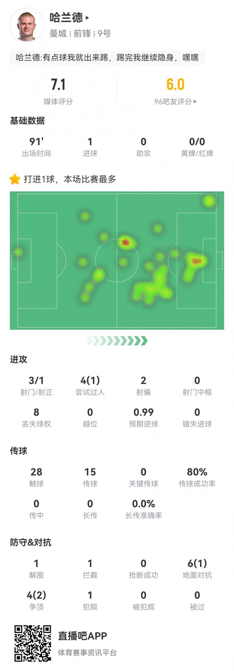 哈蘭德本場(chǎng)3射1正進(jìn)1球 4過人1成功 10對(duì)抗3成功 獲評(píng)7.1分