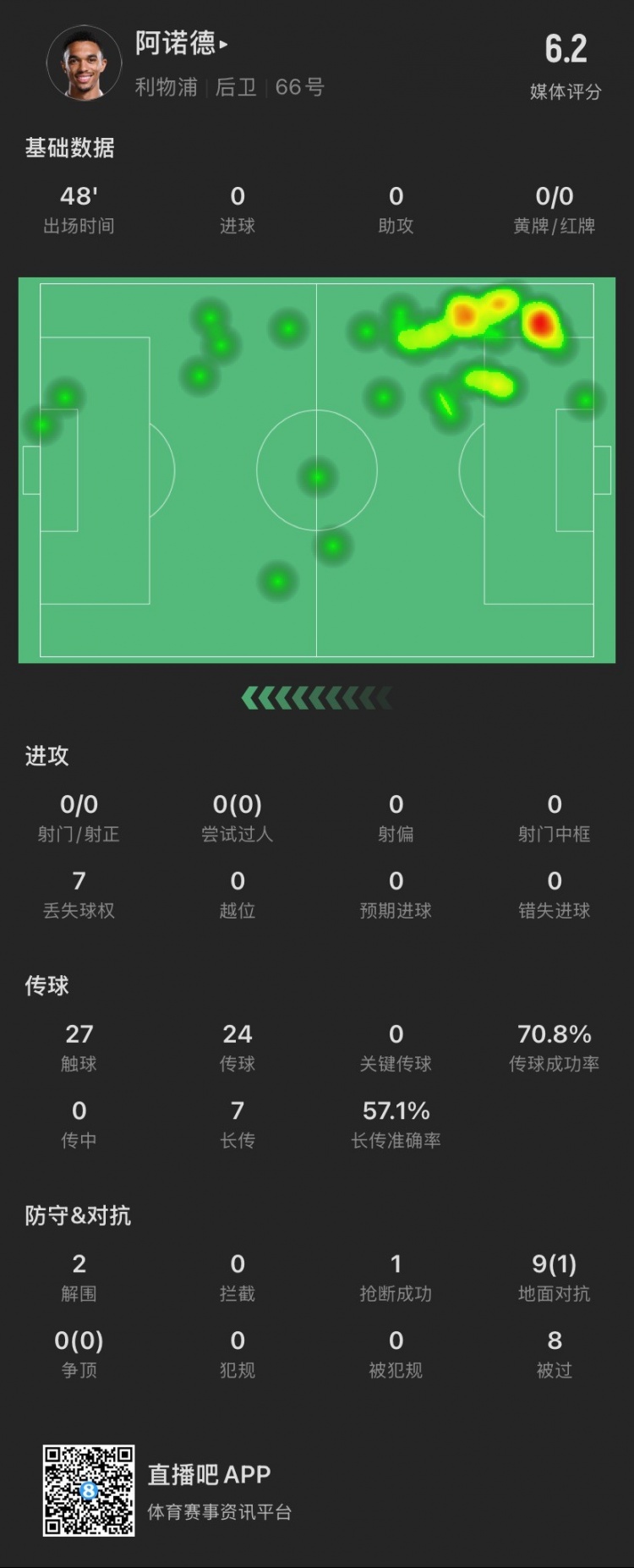 阿諾德半場:被過8次追平本賽季紀(jì)錄,9次對抗成功1次,貢獻(xiàn)2解圍