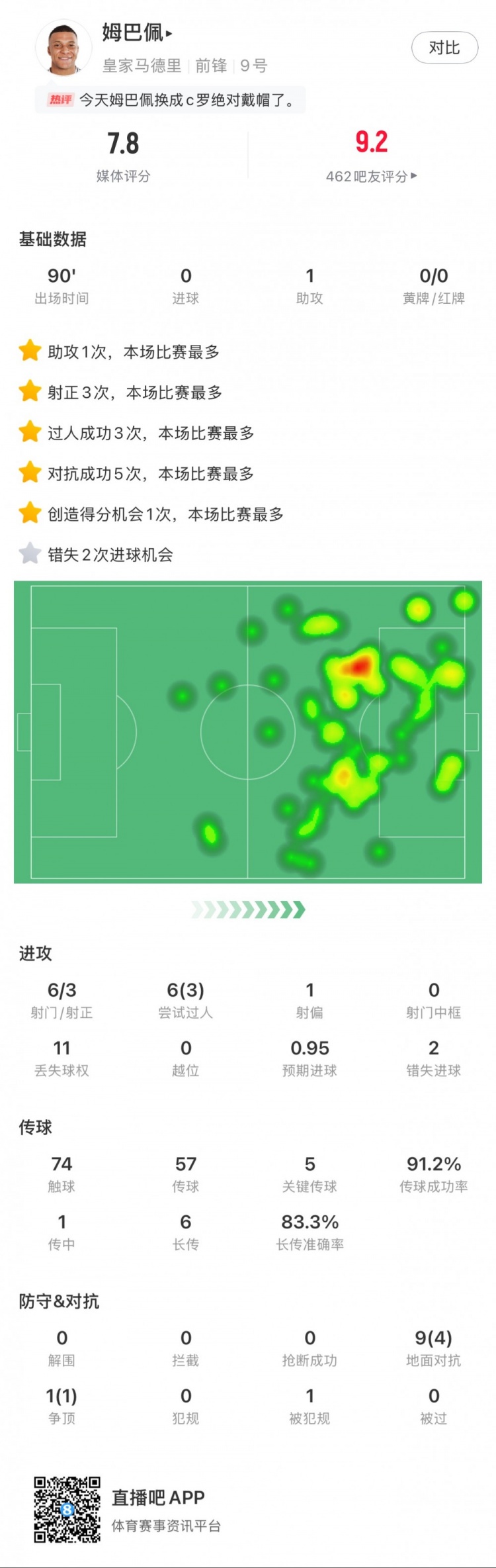 姆巴佩本場數(shù)據(jù):1次助攻,6射3正,2次錯(cuò)失得分機(jī)會,3次過人