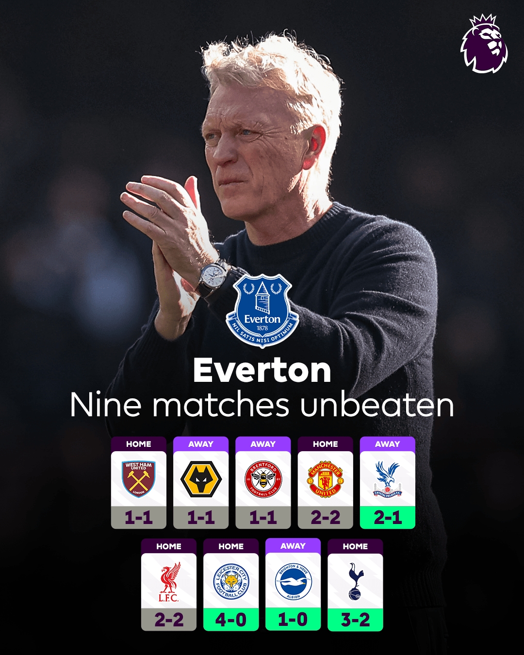 下賽季大干一場!莫耶斯率埃弗頓聯(lián)賽9場不敗,領(lǐng)先降級區(qū)17分
