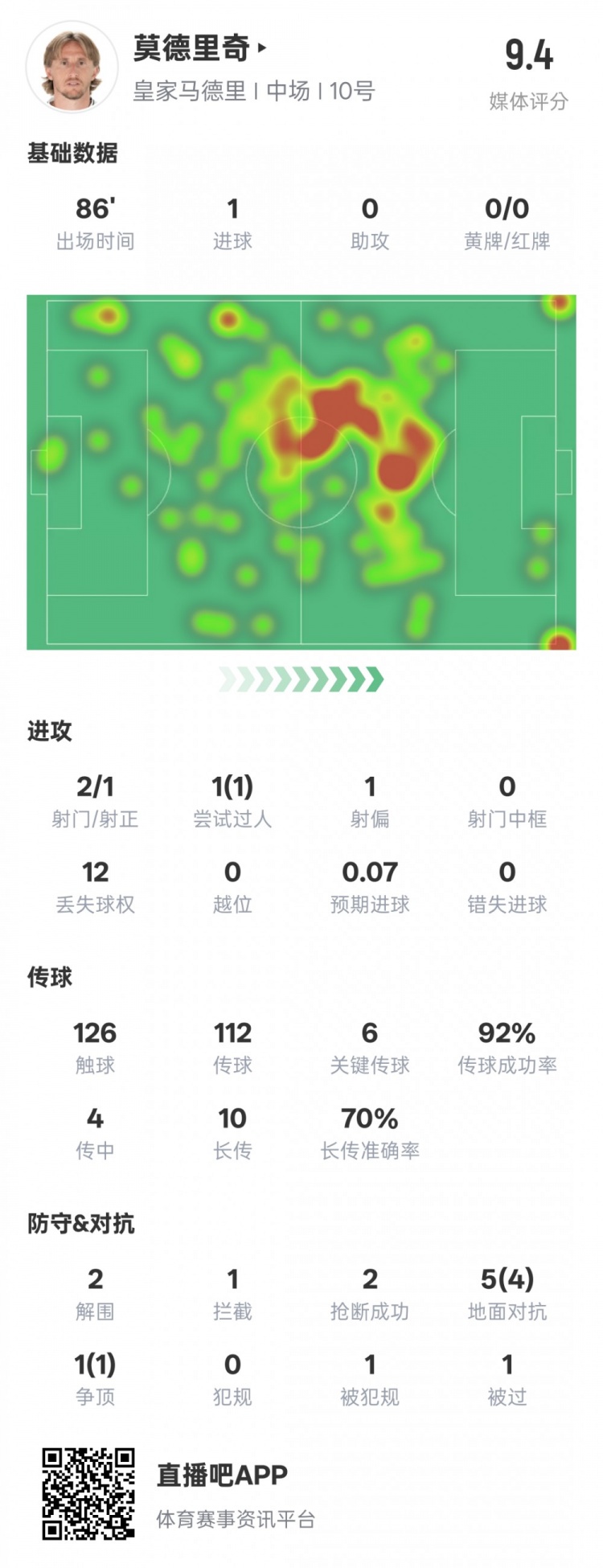 莫德里奇本場比賽數(shù)據(jù):1進球6關鍵傳球2解圍2搶斷,評分9.4