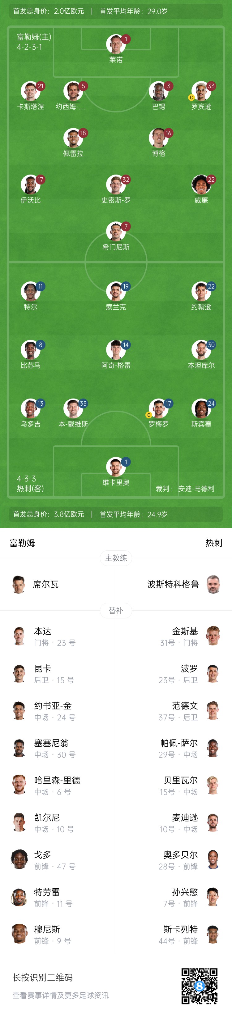 富勒姆替補:23-本達、30-塞塞尼翁、15-昆卡、6-哈里森-里德、10-凱爾尼、24-約書亞-金、47-戈多、11-特勞雷、9-穆尼斯