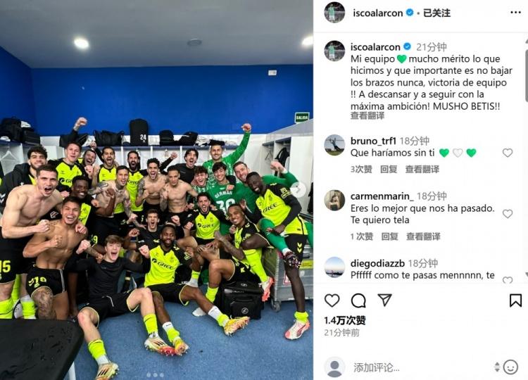 本場比賽伊斯科點射破門拉響反擊號角,賽后伊斯科也在社媒曬出更衣室內(nèi)全隊球員慶祝合影,配文寫道:“我的球隊????我們做到的事情值得被認(rèn)可,永不放棄太重要了。這是一場團隊的勝利,現(xiàn)在是時候休息調(diào)整,以最高昂的斗志繼續(xù)前進。貝蒂斯加油!”