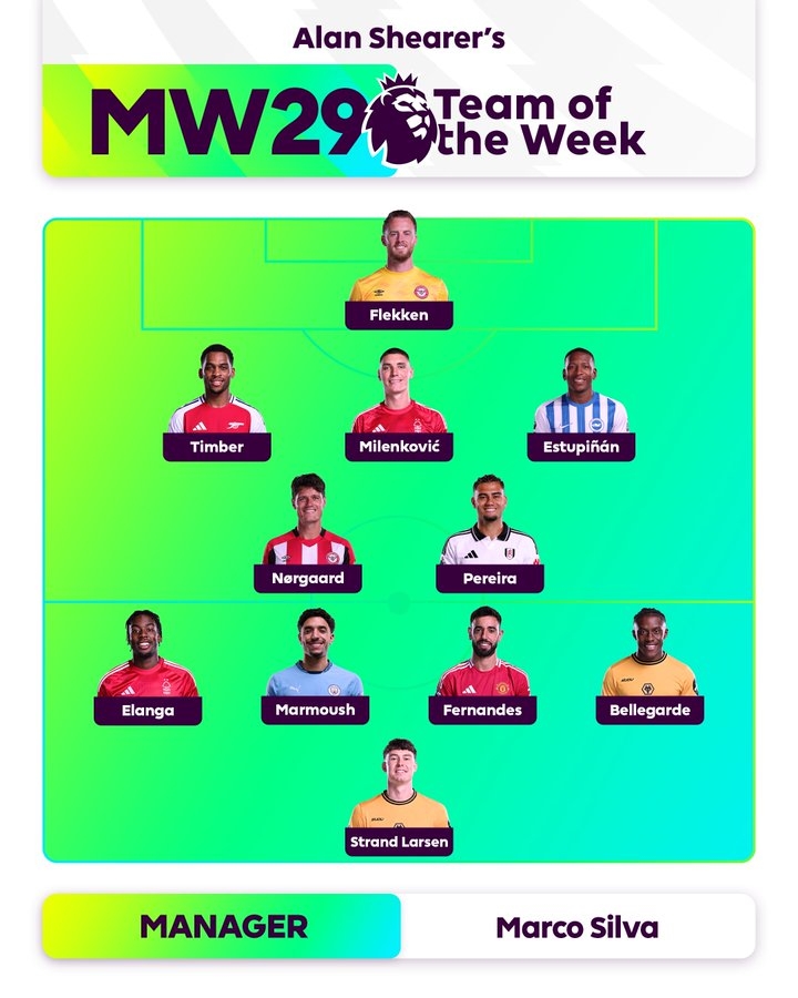 中場:諾爾高(布倫特福德)、佩雷拉(富勒姆)、伊蘭加(諾丁漢森林)、馬爾穆什(曼城)、B費(fèi)(曼聯(lián))、貝萊加德(狼隊(duì))