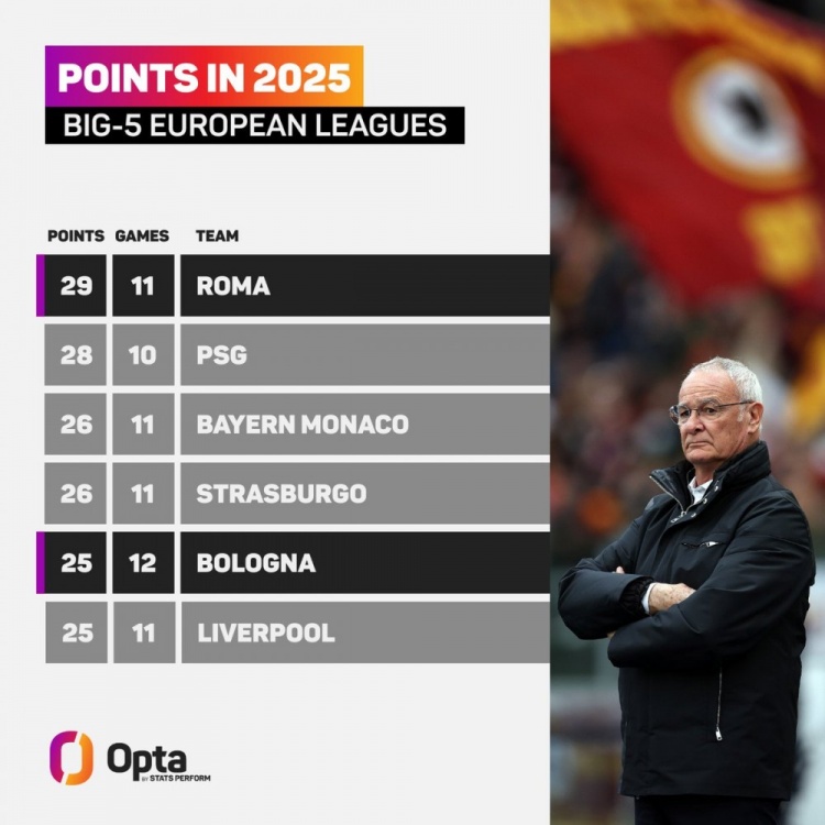 3月18日訊 國家隊比賽周來襲,五大聯(lián)賽暫時告一段落,OPTA也統(tǒng)計了2025年五大聯(lián)賽拿分情況,羅馬居首。