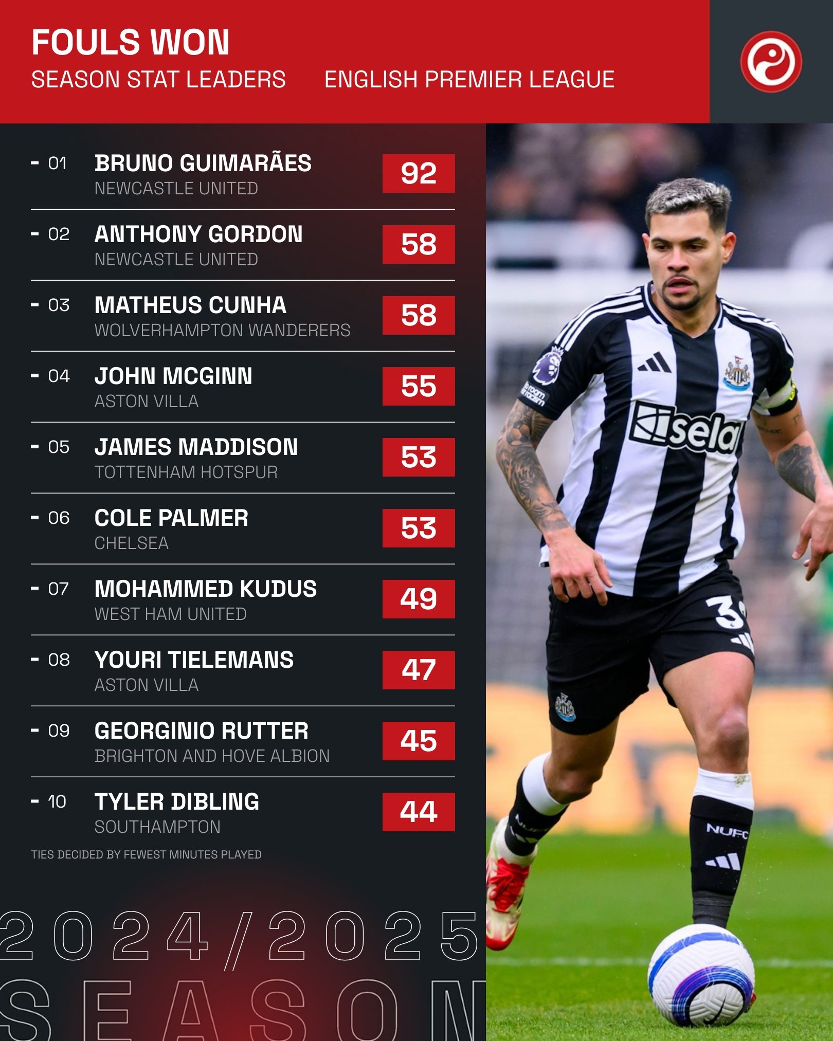 2、安東尼-戈登(紐卡),58次