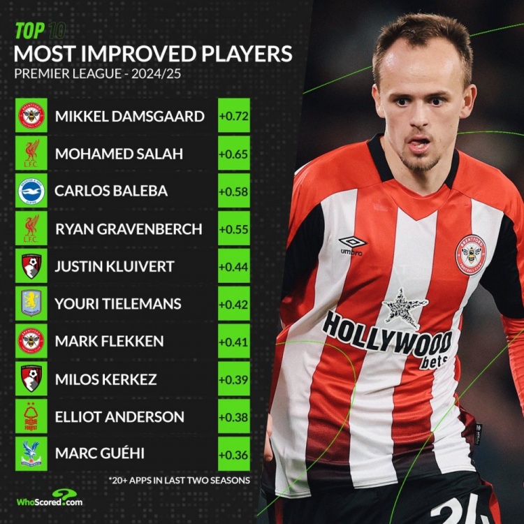 3月18日訊 whoscored統(tǒng)計了英超球員在本賽季的場均評分相比上賽季提升最多情況,達(dá)姆斯高力壓薩拉赫居首。