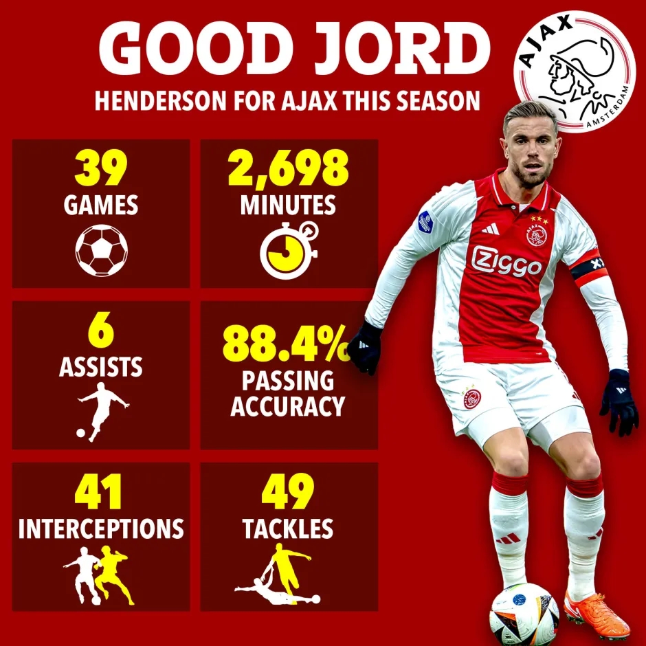 本賽季,喬丹-亨德森在阿賈克斯發(fā)揮不俗,他出戰(zhàn)39場比賽共計2698分鐘,貢獻6次助攻,傳球成功率88.4%,同時還有41次攔截和49次鏟搶。