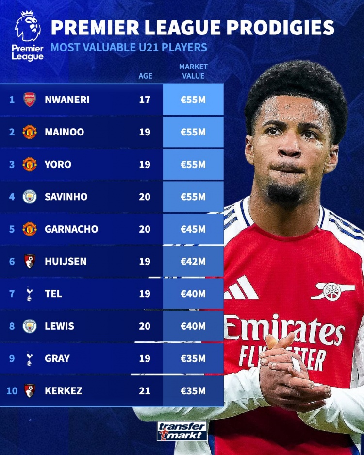 英超U21德轉身價排名: