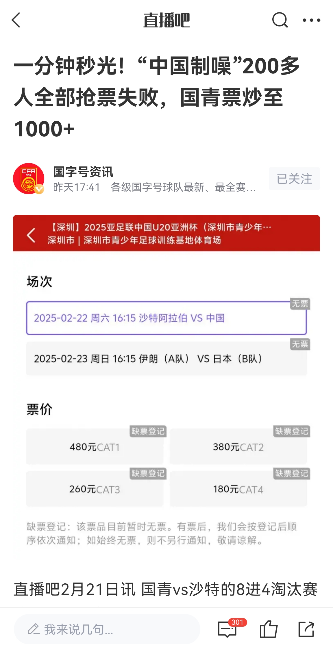 180賣2000???國青賽前現(xiàn)場空座不少,此前開票1分鐘內(nèi)秒售罄
