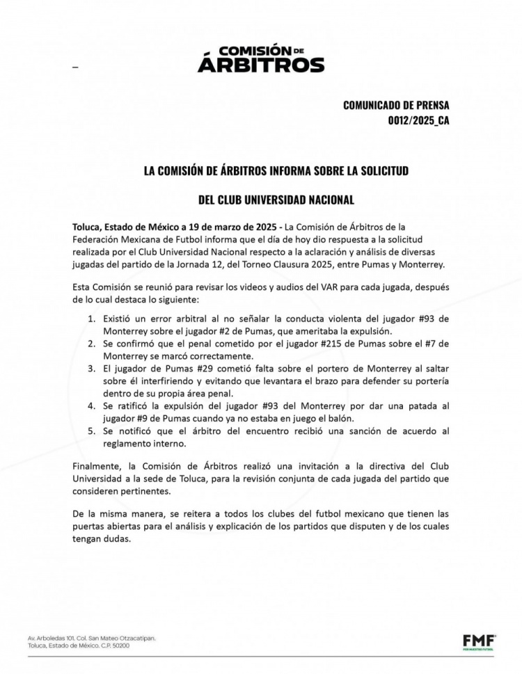 墨西哥美洲獅俱樂部賽后提出申請,希望墨西哥裁判委員會對比賽中的判罰做出澄清和分析,裁判委員會發(fā)布公告,確認(rèn)當(dāng)值主裁存在失誤,拉莫斯上半場肘擊對手就應(yīng)該被罰下,但裁判沒有對其出示紅牌。