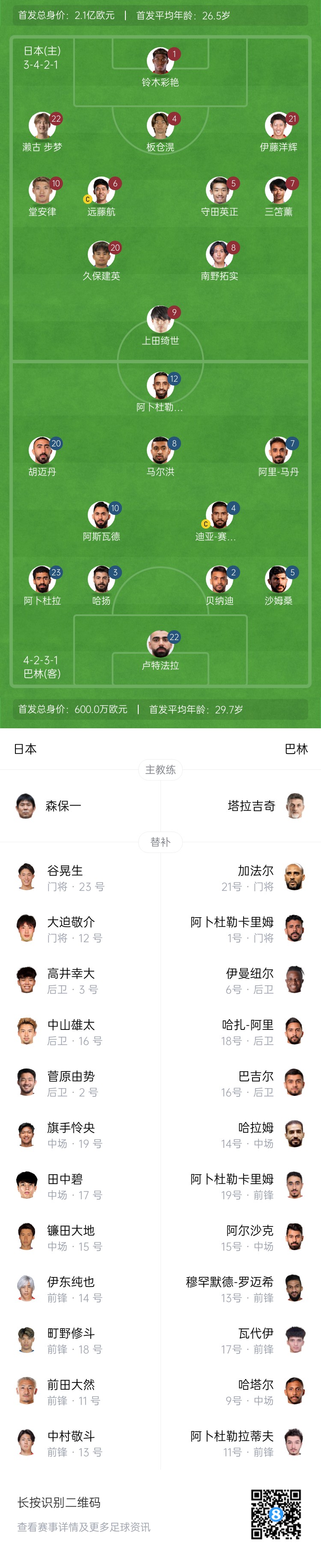 日本替補(bǔ):12-大迫敬介、23-谷晃生、2-菅原由勢(shì)、3-高井幸大、11-前田大然、13-中村敬斗、14-伊東純也、15-鐮田大地、16-中山雄太、17-田中碧、18-町野修斗、19-旗手憐央