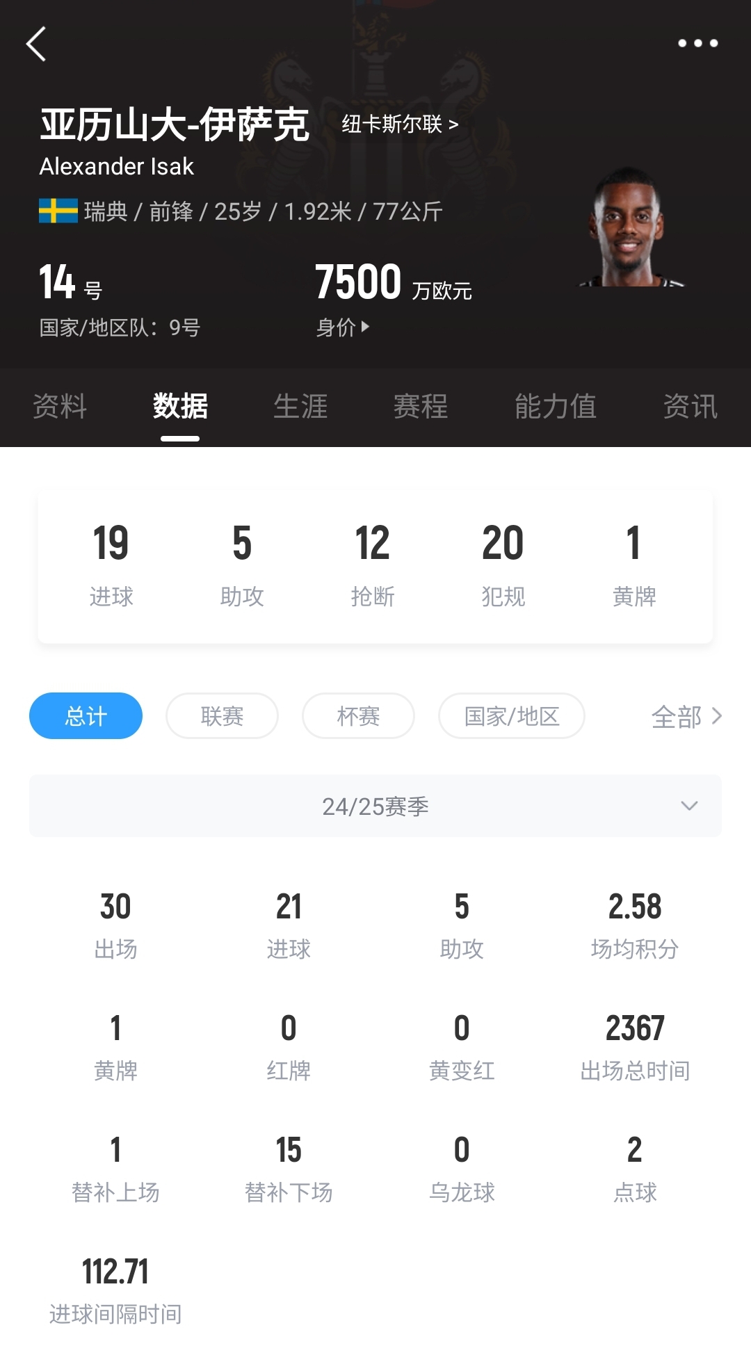2022年夏窗紐卡花費7000萬歐簽下球員。本賽季25歲的伊薩克為紐卡出戰(zhàn)30場比賽,打進21球并有5次助攻,目前球員德轉(zhuǎn)身價7500萬歐。