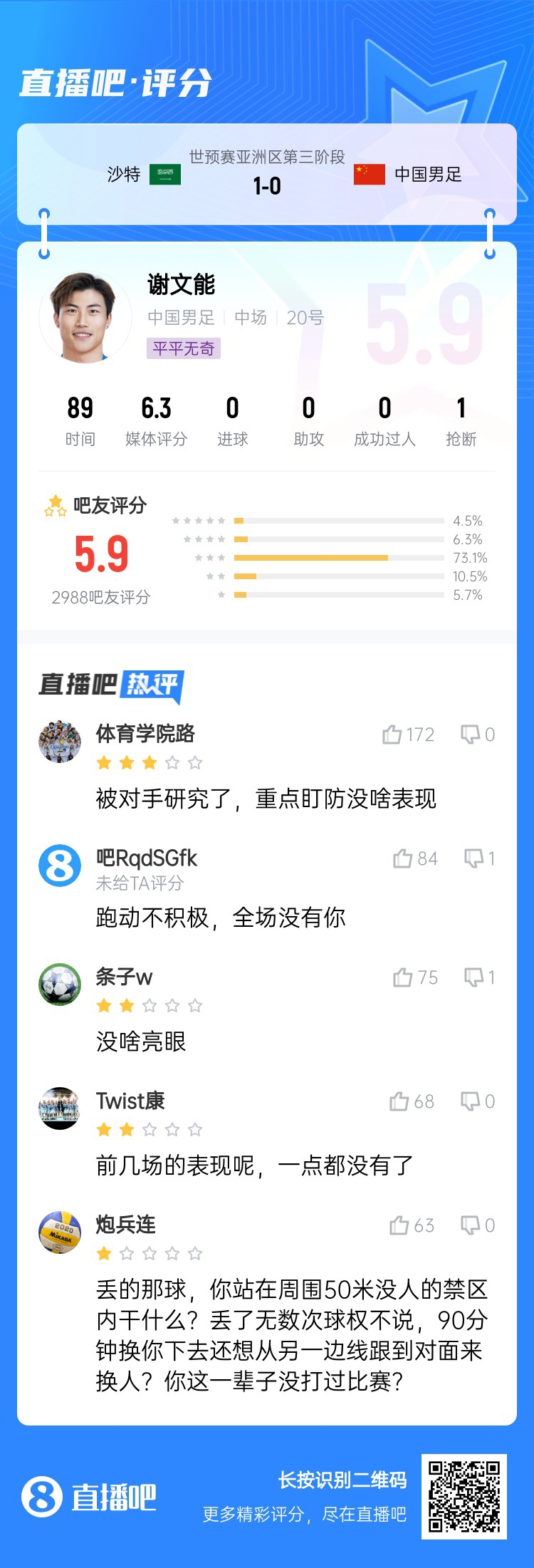 18強賽關(guān)鍵戰(zhàn),國足0-1不敵沙特,沒能擺脫小組墊底。吧友評分中,國足中場球員普遍低分,韋世豪5.1分,王上源2.2分,曹永競2.8分,謝文能5.9分。