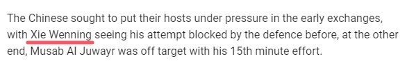 亞足聯(lián)官網(wǎng)在報(bào)道本場(chǎng)比賽時(shí)鬧出烏龍,他們?cè)趹?zhàn)報(bào)中將國足中場(chǎng)謝文能的拼音名“Xie Wenneng”寫為了“Xie Wenning”。