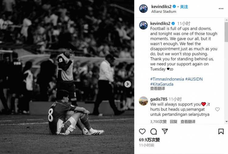 3月21日訊 印尼球員迪克斯更新社媒,發(fā)文總結(jié)印尼1-5不敵澳大利亞的比賽。