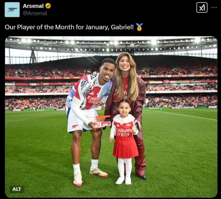 2月24日訊 阿森納官方消息,加布里埃爾當選球隊1月份最佳球員。球隊官推也曬出加布里埃爾與家人的合影,為其送上祝賀。