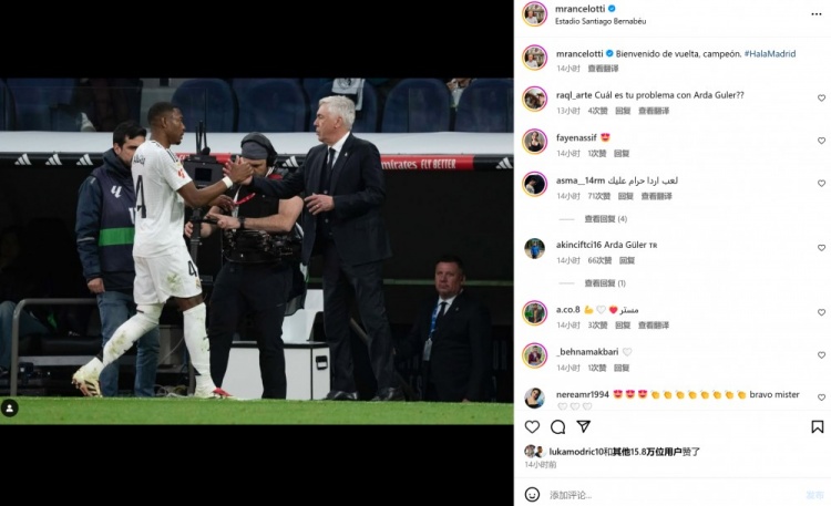 賽后安切洛蒂也在個人社媒曬出與阿拉巴的合照,配文寫道:“歡迎回來,冠軍!”