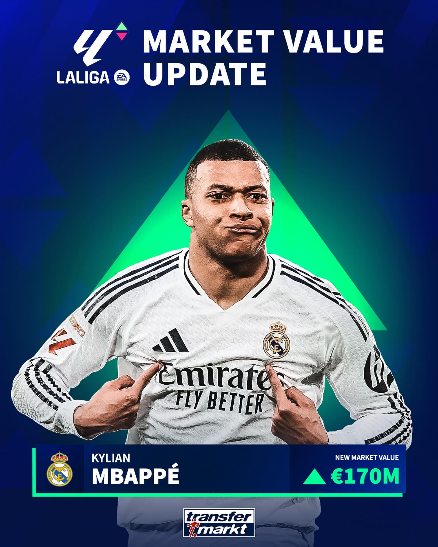03月21日訊 今日德國轉(zhuǎn)會市場更新了西甲球員身價,姆巴佩上漲1000萬歐至1.7億歐。