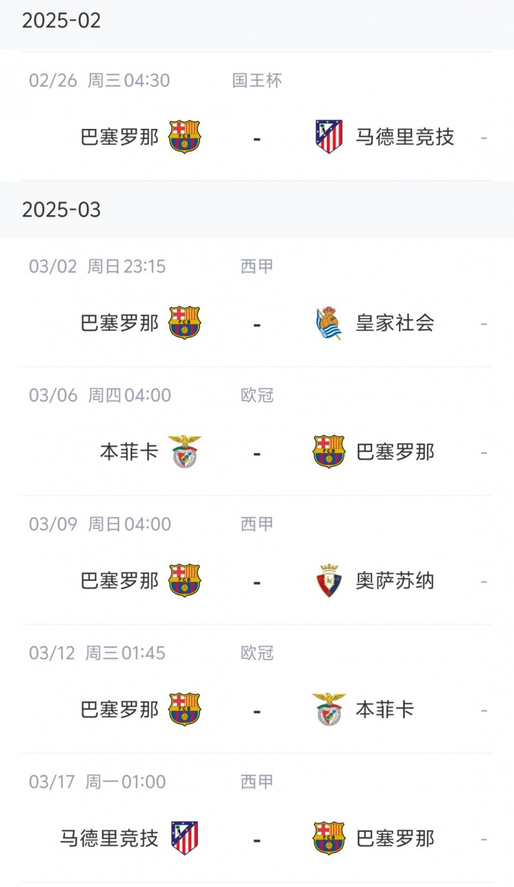 2月24日訊 未來(lái)三周,巴薩、皇馬和馬競(jìng)將迎來(lái)一系列關(guān)鍵賽事。《每日體育報(bào)》報(bào)道,巴薩的賽程相對(duì)較為有利,六場(chǎng)比賽中將有四場(chǎng)主場(chǎng)作戰(zhàn)。