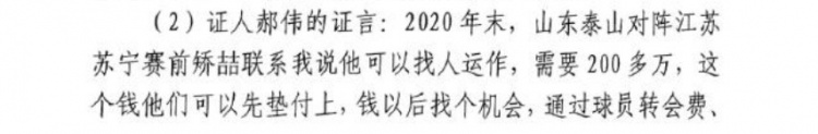 2020年末,山東泰山對(duì)陣江蘇蘇寧賽前矯喆聯(lián)系我說他可以找人運(yùn)作,需要200多萬(wàn),這個(gè)錢他們可以先墊付上,錢以后找個(gè)機(jī)會(huì),通過球員轉(zhuǎn)會(huì)費(fèi)、簽字費(fèi)把錢賺回來,我同意了,矯喆就去做江蘇球員“工作”,加上我這邊讓球員全力以赴去踢,最終這場(chǎng)比賽的比分是山東泰山隊(duì)2-0江蘇蘇寧,我們(足協(xié)杯)奪冠了。矯喆和我說他們運(yùn)作這場(chǎng)球花了200萬(wàn),這個(gè)錢是矯喆他們出的。我沒有主動(dòng)還過這個(gè)錢,但是我把矯喆招到我們隊(duì)當(dāng)助理教練了,給他找了個(gè)工作,也算是還他幫我的運(yùn)作這場(chǎng)比賽的人情了。