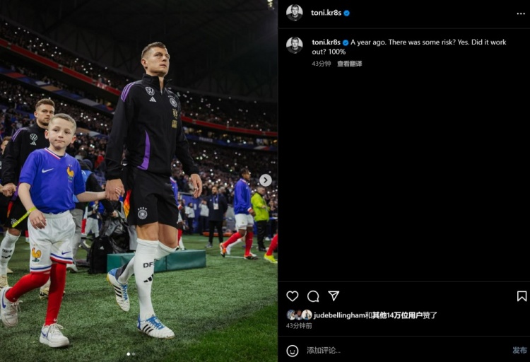 克羅斯紀(jì)念回歸德國隊(duì)首秀一周年:雖然有風(fēng)險(xiǎn),但100%成功了