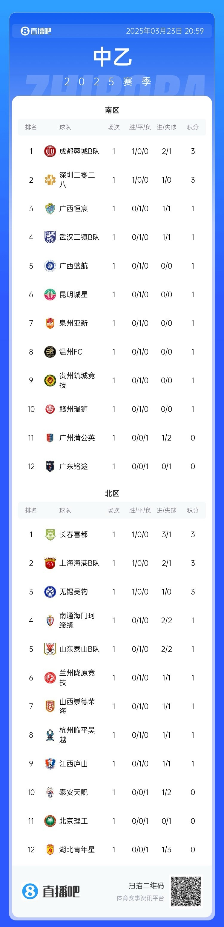 3月23日訊 中乙聯(lián)賽第一輪今天結(jié)束全部爭奪,蓉城B隊(duì)2-1擊敗廣州蒲公英,三鎮(zhèn)B隊(duì)?wèi)?zhàn)平廣西恒宸,無錫吳鉤、長春喜都、深圳二零二八收獲開門紅。