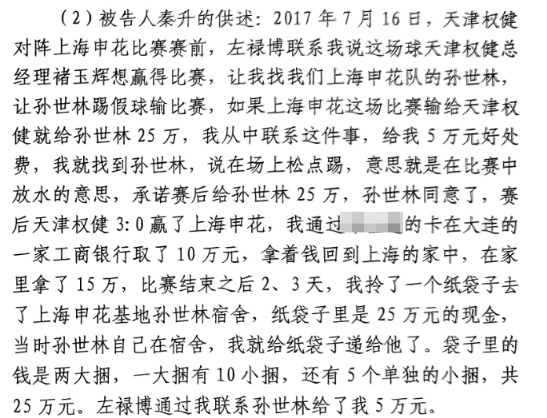 被告人秦升的供述:2017年1月16日,天津權(quán)健對陣上海申花比賽賽前,左祿博聯(lián)系我說這場球天津權(quán)健總經(jīng)理褚玉輝想贏得比賽,讓我找我們上海申花隊(duì)的孫世林,讓孫世林踢假球輸比賽,如果上海申花這場比賽輸給天津權(quán)健就給孫世林25萬,我從中聯(lián)系這件事,給我5萬元好處費(fèi),我就找到孫世林,說在場上松點(diǎn)踢,意思就是在比賽中放水的意思,承諾賽后給孫世林25萬,孫世林同意了,賽后天津權(quán)健3:0贏了上海申花,我通過的XXX卡在大連的一家工商銀行取了10萬元,拿著錢回到上海的家中,在家里拿了15萬,比賽結(jié)束之后2、3天,我拎了一個紙袋子去了上海申花基地孫世林宿舍,紙袋子里是25萬元的現(xiàn)金,當(dāng)時孫世林自己在宿舍,我就給紙袋子遞給他了。袋子里的錢是兩大捆,一大捆有10小捆,還有5個單獨(dú)的小捆,共25萬元。左祿博通過我聯(lián)系孫世林給了我5萬元。