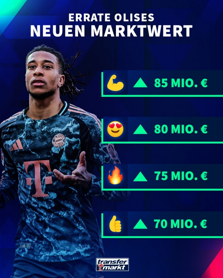 奧利塞目前的德轉(zhuǎn)身價(jià)為6500萬(wàn)歐元,對(duì)于他接下來(lái)的最新身價(jià),德轉(zhuǎn)給出了4個(gè)選項(xiàng),由低到高為7000萬(wàn)歐、7500萬(wàn)歐、8000萬(wàn)歐、8500萬(wàn)歐。
