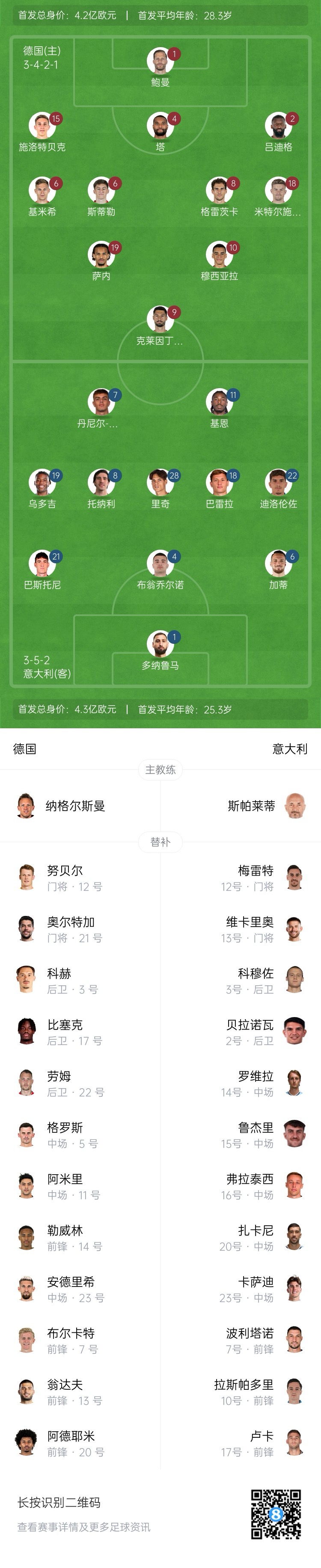 3月24日訊 歐國聯(lián)1/4決賽次回合,德國vs意大利首發(fā)出爐。陣容更新中。首回合對(duì)陣,德國2-1意大利。