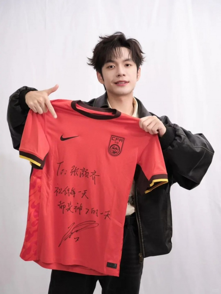 3月24日訊 在個(gè)人社媒,歌手張顏齊曬出武磊to簽的國足球衣。