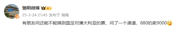 駱明表示:有朋友問(wèn)還能不能搞到國(guó)足對(duì)澳大利亞的票,問(wèn)了一個(gè)渠道,880的賣(mài)9000[饞嘴] ???