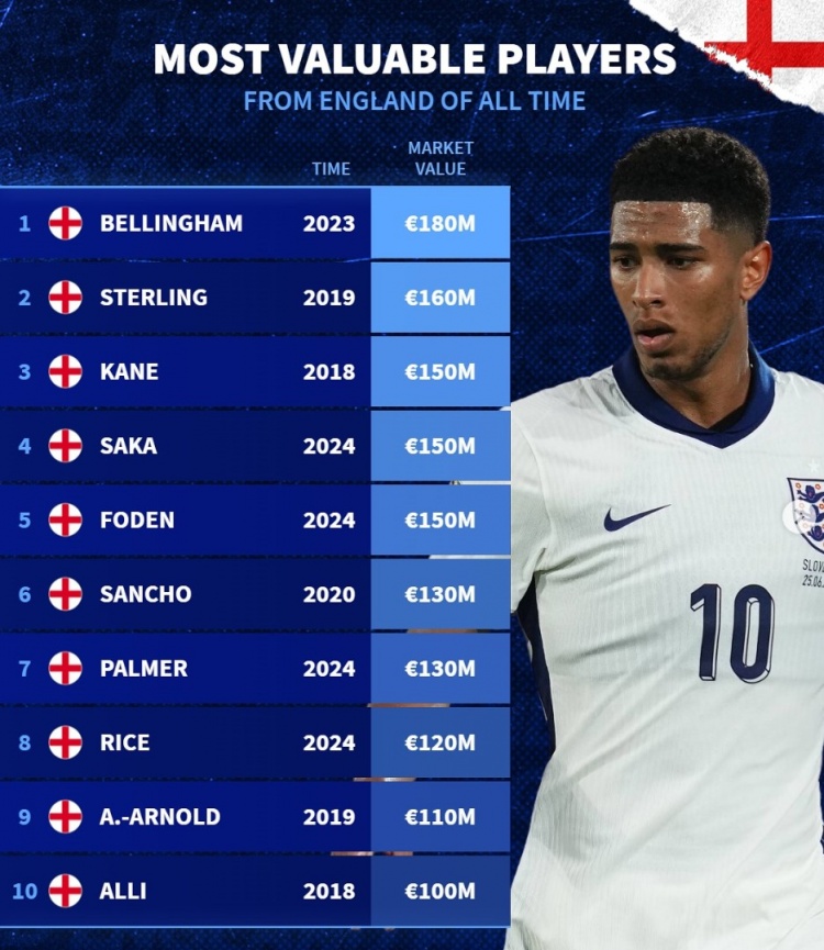 3月25日訊 英格蘭將在本輪世預(yù)賽主場(chǎng)迎戰(zhàn)拉脫維亞,《轉(zhuǎn)會(huì)市場(chǎng)》也統(tǒng)計(jì)了英格蘭球員歷史身價(jià)前十均達(dá)到1億歐元大關(guān)。