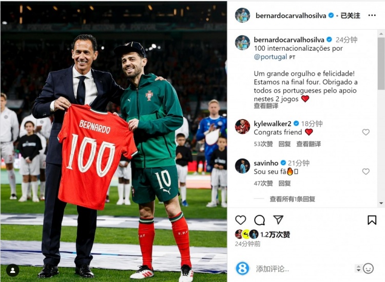 此役是B席為葡萄牙隊(duì)出戰(zhàn)的第100場(chǎng)比賽,因此獲贈(zèng)紀(jì)念球衣。他在社交媒體上曬出照片,并寫(xiě)道:“為葡萄牙國(guó)家隊(duì)出戰(zhàn)100場(chǎng)比賽,我感到非常自豪和高興!我們進(jìn)入了四強(qiáng),感謝所有葡萄牙球迷在兩回合比賽中的支持?!?/p>
