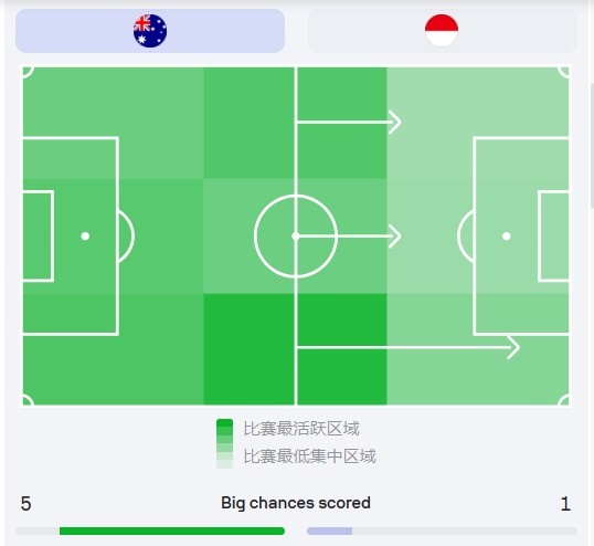 澳大利亞玩的就是效率,控球率、進攻三區(qū)進入次數(shù)比印尼還少,可比分卻是大勝(藍(lán)色方為印尼)