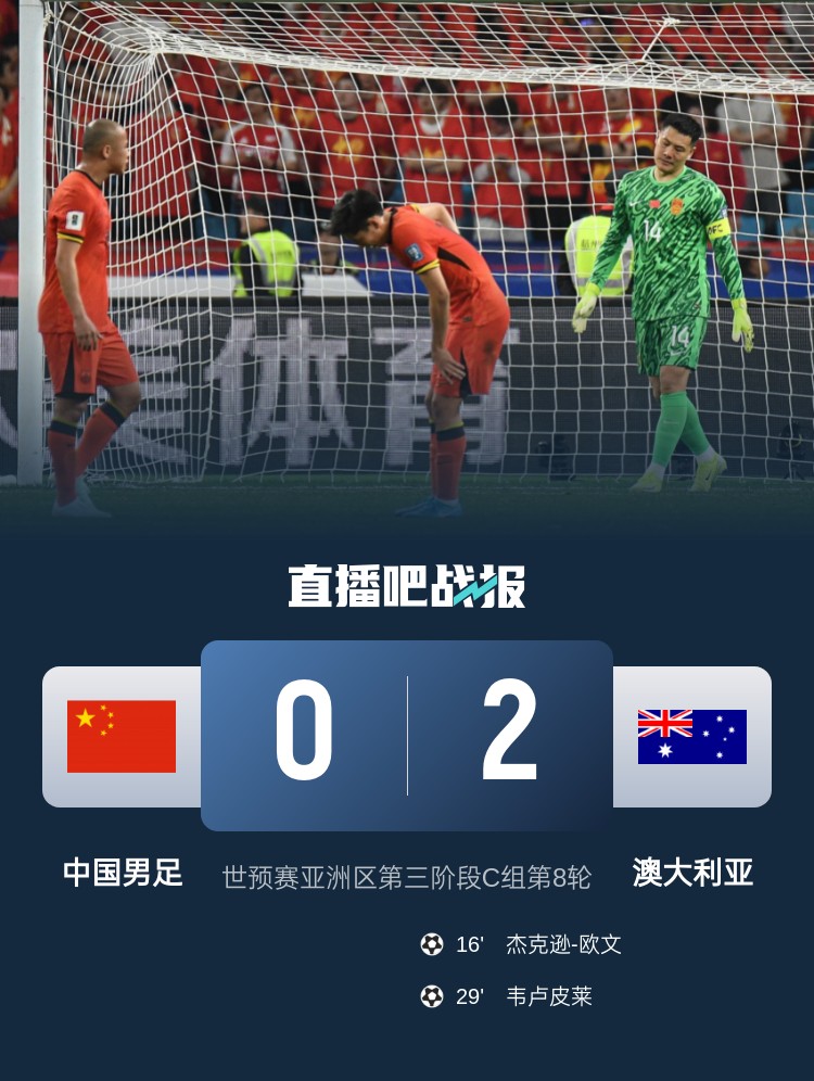 3月25日訊 18強賽C組第8輪,國足主場0-2不敵澳大利亞,遭遇3連敗,8輪積6分繼續(xù)墊底,無緣直通美加墨世界杯。