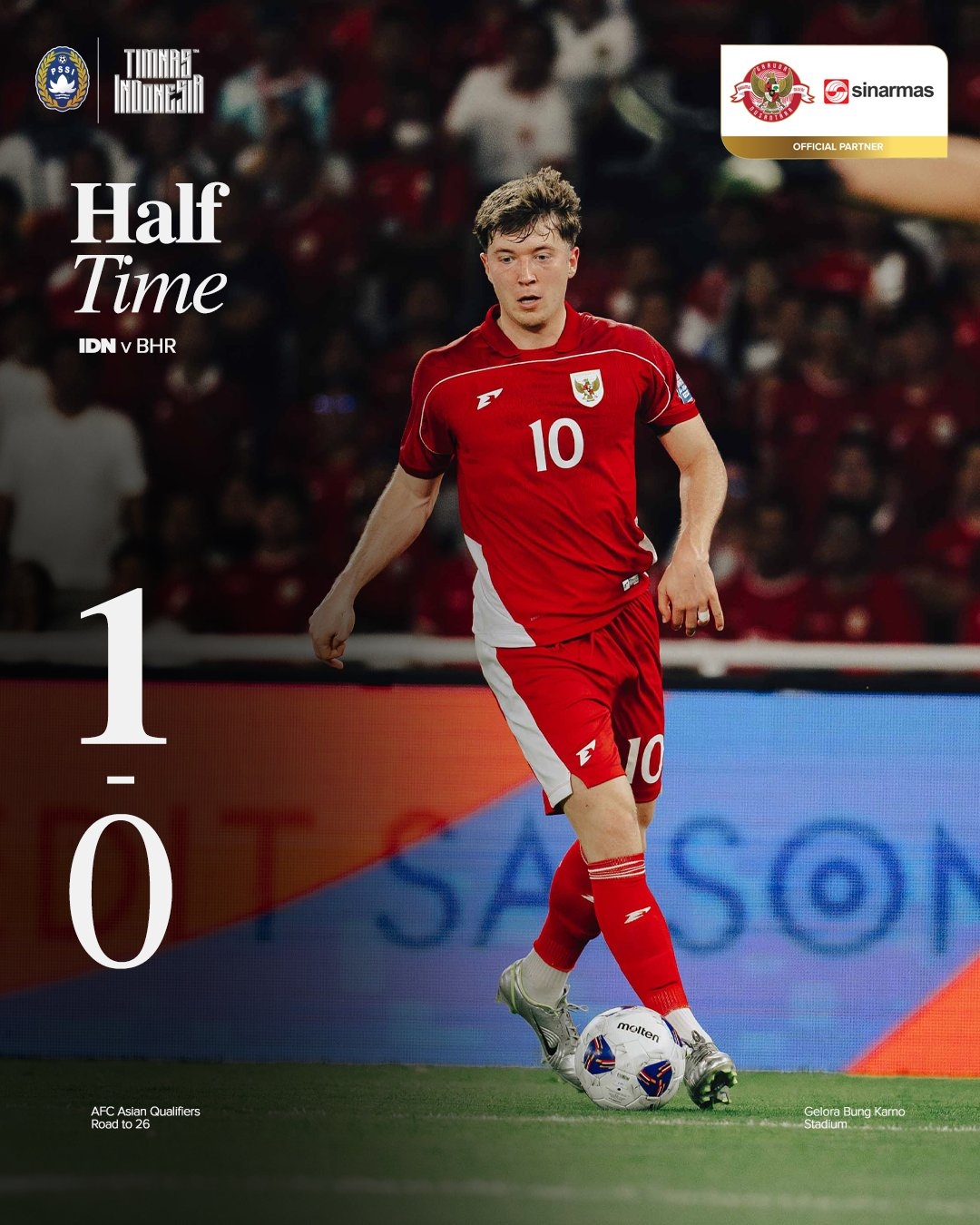 傷停補時1分鐘。上半場比賽結(jié)束,印尼1-0巴林。