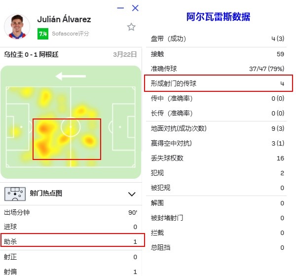 從統(tǒng)計數(shù)據(jù)可以看到,阿爾瓦雷斯全場只射門1次,卻送出4次關(guān)鍵傳球,最終帶來一記決定勝負的助攻。