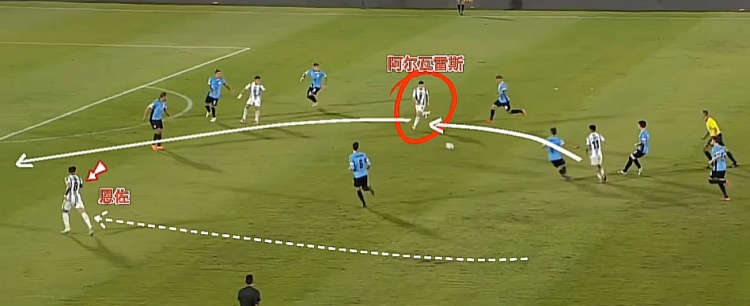 從上一場客場與烏拉圭的世預賽可以看到,阿爾瓦雷斯被當做一個老年版、不過人的梅西來使用。