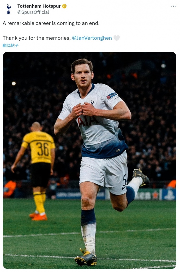 熱刺官方社媒曬出維爾通亨效力球隊時期的照片,并配文:“非凡的職業(yè)生涯即將結束,感謝你留下的回憶,維爾通亨?!?/p>