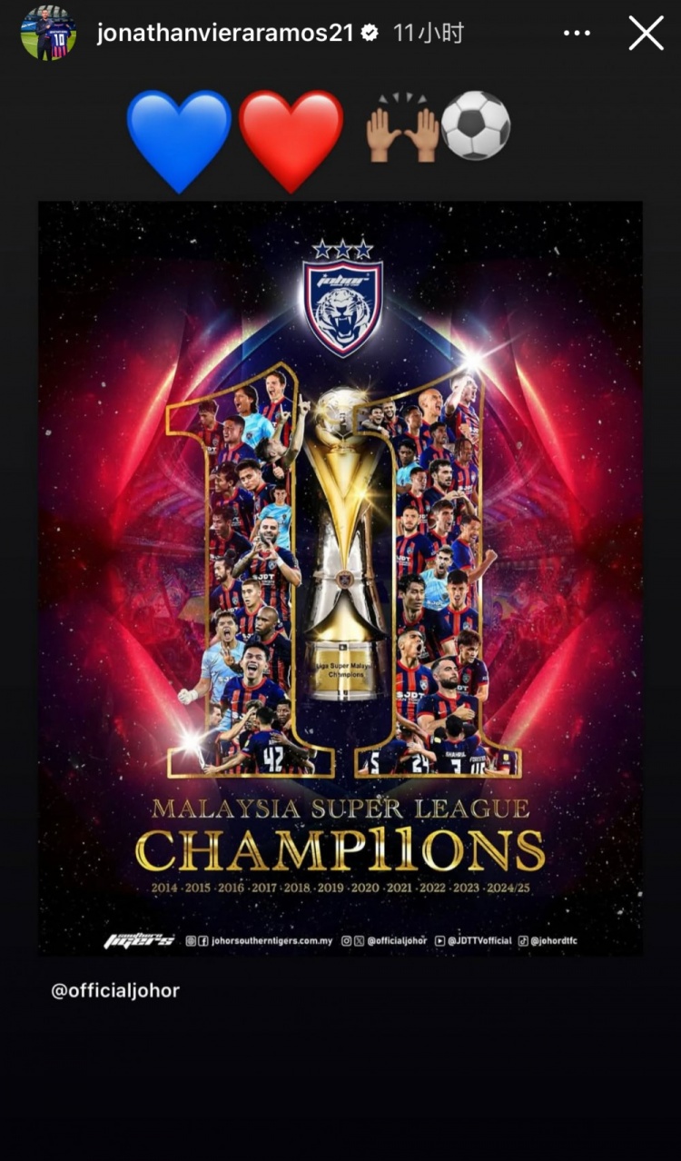 24日進行的馬來西亞超級聯(lián)賽第22輪比賽,柔佛新山主場2-0擊敗霹靂,提前4輪問鼎本賽季冠軍。賽后,比埃拉曬出了奪冠的海報,并附上了多個表情慶祝柔佛新山提前奪冠。