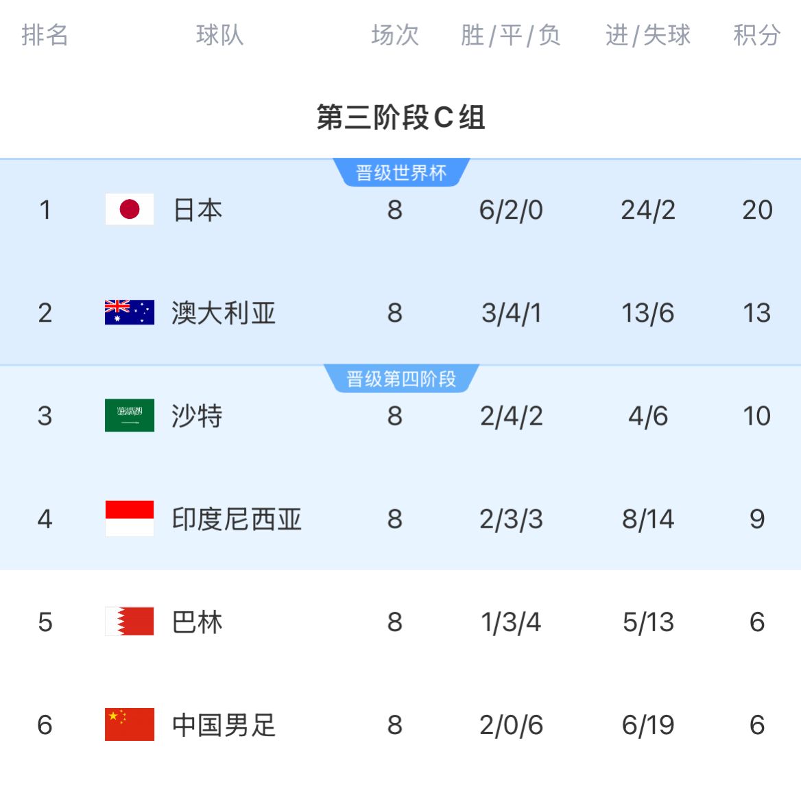 18強(qiáng)賽積分榜:中國(guó)巴林6分倒一倒二 印尼9分位居第4 沙特10分第3