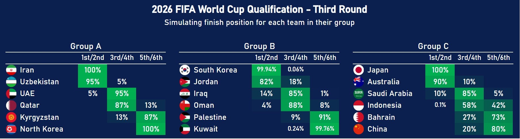 其中中國隊20%排3/4(附加賽),80%排在5/6(無緣世界杯),而印尼58%概率獲得附加賽資格。