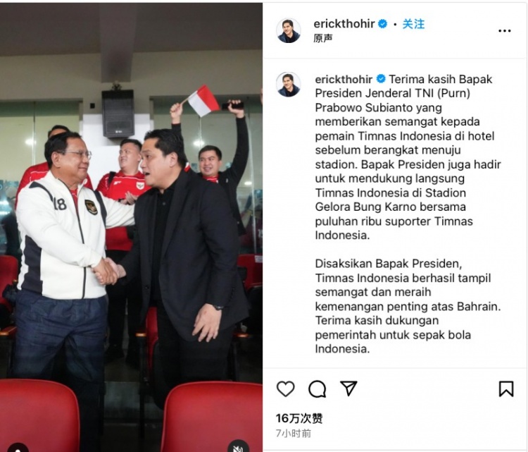 賽后印尼足協(xié)主席托希爾更新社媒,曬出了印尼總統(tǒng)蘇比延多親臨現(xiàn)場(chǎng)觀戰(zhàn)的Vlog,并配文寫(xiě)道: