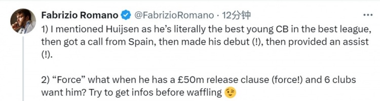 羅馬諾回復(fù)道:“第一,我提到懷森是因?yàn)樗_實(shí)是最佳聯(lián)賽中最為出色的年輕中衛(wèi),他得到西班牙隊(duì)的征召,然后上演了國(guó)家隊(duì)的首秀,并送出助攻。”