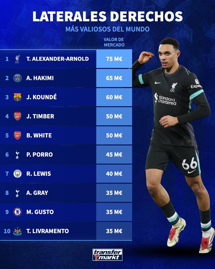 3月28日訊 媒體盛傳,阿諾德即將自由身轉(zhuǎn)會(huì)加盟皇馬。德國轉(zhuǎn)會(huì)市場今日列出右后衛(wèi)球員身價(jià)排名,阿諾德7500萬歐元第一。
