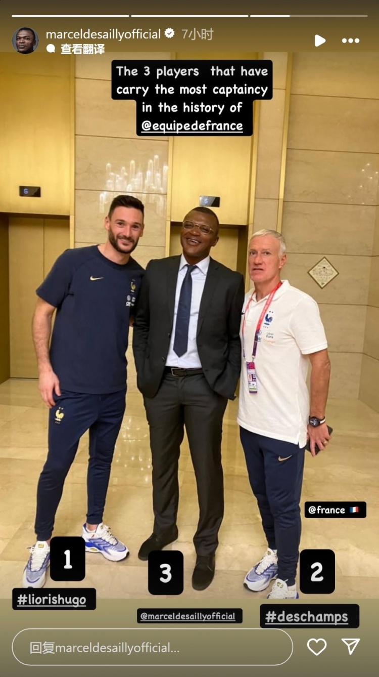 德塞利社媒曬出與德尚、洛里的合照,并配文:“法國隊史擔(dān)任隊長次數(shù)最多的三名球員。”