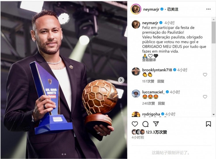 內馬爾在對陣國際里梅拉的比賽中的角球直接破門當選圣保羅州聯(lián)賽最佳進球,他在社交媒體上曬出領獎照片,配文:“很高興參加圣保羅州聯(lián)賽頒獎典禮,感謝圣保羅州足協(xié),感謝投票支持我的進球的球迷,感謝上帝在我生命中所做的一切!”