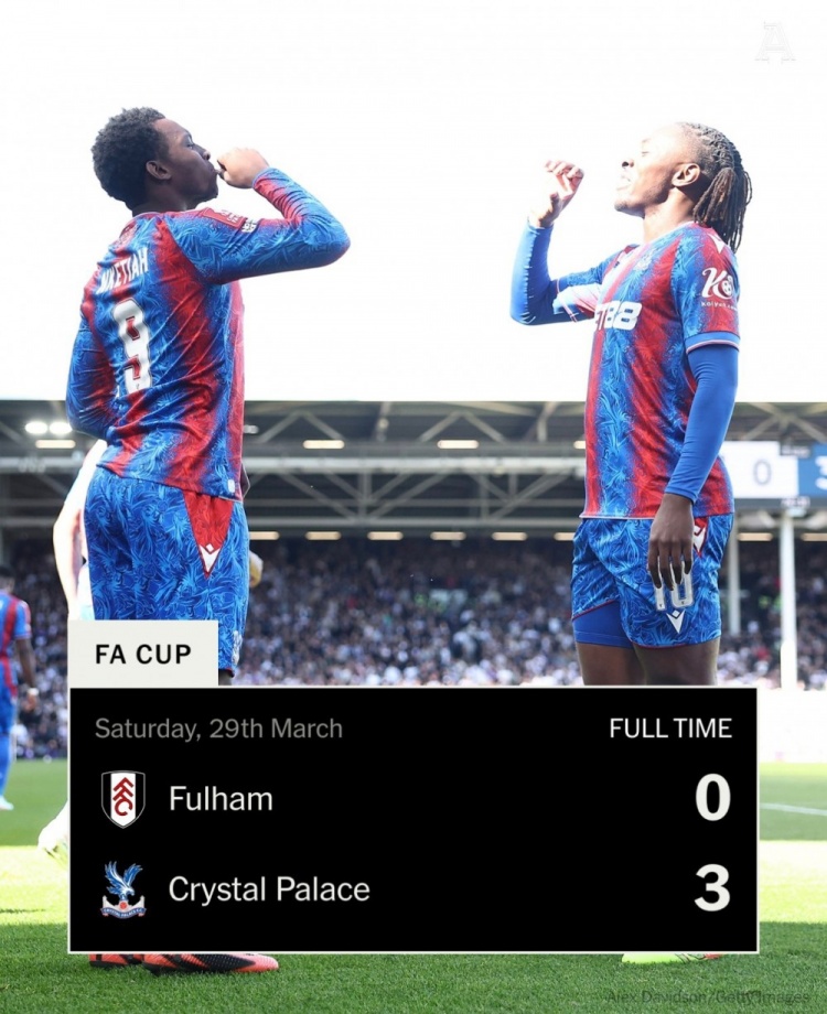 3月29日訊 在足總杯1/4決賽,水晶宮客場(chǎng)3-0完勝富勒姆晉級(jí)半決賽。